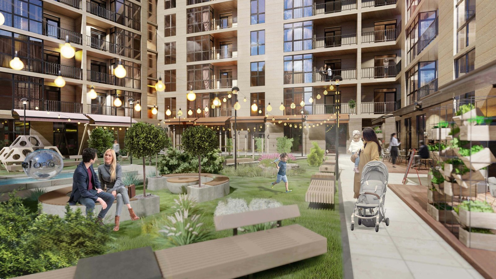 На території житлового комплексу знайдете все необхідне для комфортного життя. Сюди входять дитячі майданчики, зони відпочинку та зелені насадження, які створюють чудову атмосферу для проживання. У комплексі передбачено: